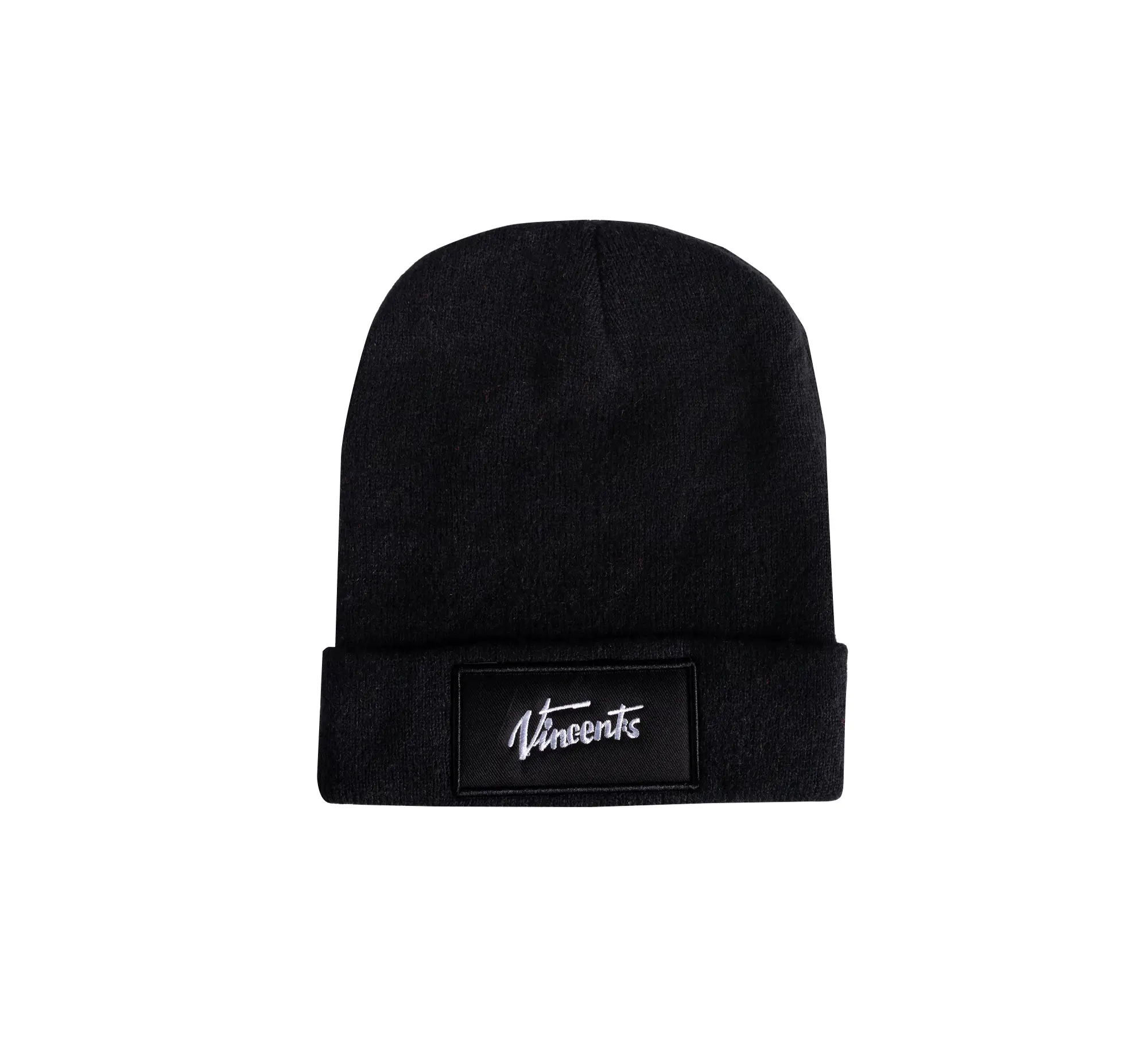 Klassig stickad mössa i svart med bred kant och Vincents emblem broderat framtill.